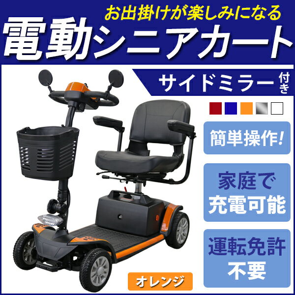 送料無料 電動シニアカート オレンジ 電動カート シルバーカー サイドミラー 車椅子 TAISコード取得済 運転免許不要 電動車いす 電動車椅子 介護 福祉 バックミラー 鏡 充電 シート回転 折りたたみ 軽量 四輪車 4輪車 移動 高齢者 お年寄り 乗り物 スクーター scooters02or ◆◆電動シニアカート◆◆ ●運転免許は不要!家庭用電源で充電可能な電動シニアカートです。