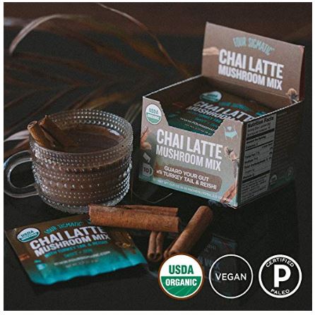 厳選されたキノコエキスをデュアル抽出法で丁寧に抽出 チャイラテ【カワラタケ/レイシ霊芝】Turkey Tail & Reishi Mushrooms リラックス 1食あたり: カワラタケ300mg 霊芝200mg ココナッツミルク、ココナッツパーム砂糖、シナモン、ターキーテイル、カルダモン、レイシ、ジンジャー、クローブ、ブラックペッパー、ステビア、シナモン(すべてオーガニック) ※Four Sigmaticのマッシュルームコーヒーを買うと、売上の一部がBoarding for Breast Cancer(乳がん予防のための慈善団体)に寄付されます。